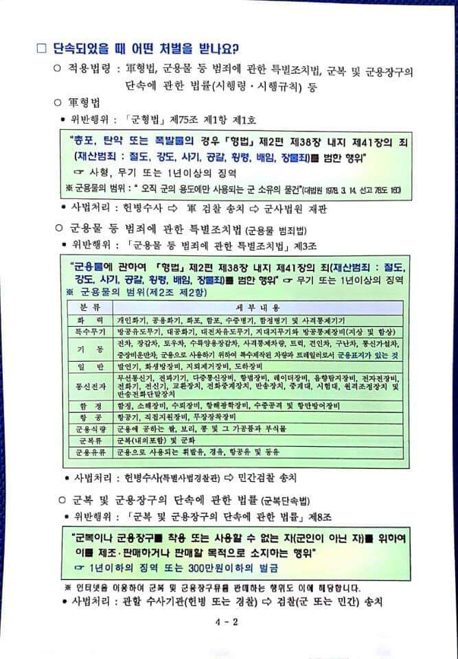 ○적용법령: 군형법, 군용물 등 범죄에 관한 특별조치법, 군복 및 군용장구의 단속에 관한 법률(시행령·시행규칙) 등