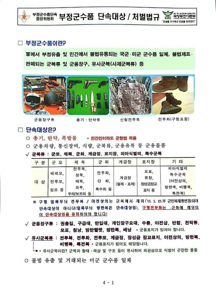 군에서 부정유출 및 민간에서 불법유통되는 국군·미군 군수품 일체, 불법제조·판매되는 군복류 및 군용장구, 유사군복(사제군복류) 등