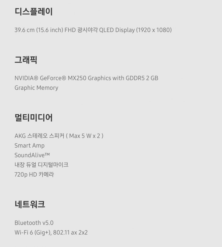 화면 크기 : 39.6 cm (15.6 inch) FHD 광시야각 QLED Display