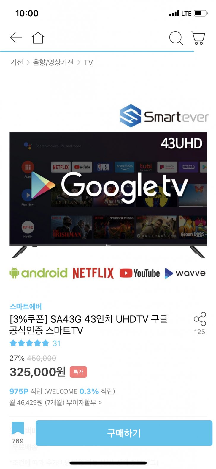 TV.냉장고.세탁기 스마트에버 SA43G 43인치 UHD 구글 공식인증 스마트tv