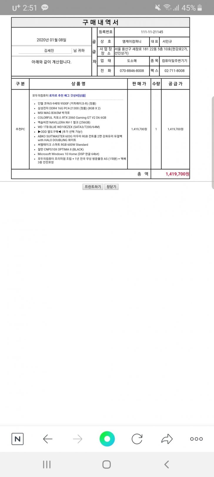 사양은 세번째 사진에 구매내역서에 나와있고