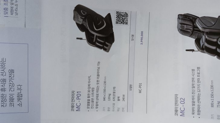 안마의자 판매 해요MC-P01모델 이구요 구매후 사용하지 앓아 새상품 이나 다름 없음니다 자리가 좁고 사용하지 않아 판매합니다
